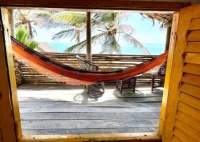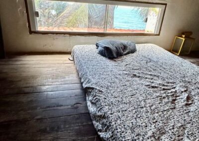 Cama de casal com vista especial do mar, banheiro compartilhado, espaço relax de frente para o mar com mesa para 4 pessoas, rede e puff.