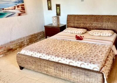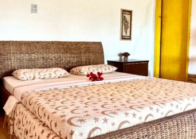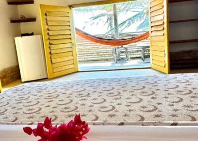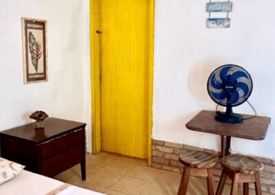 Quarto térreo de 20 metros quadrados, cama de casal, banheiro privativo, varanda com rede, café da manhã com vista para o mar, ventilador e frigobar.