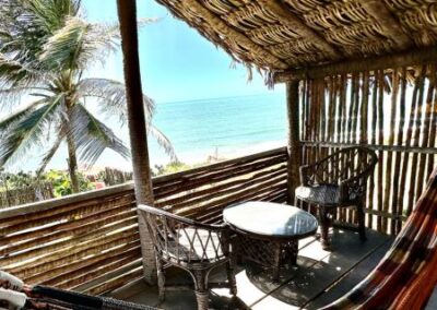 Quarto de 20 metros quadrados, cama de casal, banheiro privativo, varanda com rede, café da manhã com vista para o mar, ventilador e frigobar.